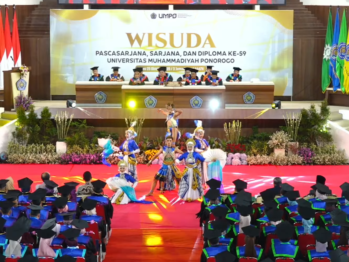 UMPO.AC.ID - Suasana Wisuda ke-59 Universitas Muhammadiyah Ponorogo (UMPO) semakin semarak dengan penampilan istimewa Tari Indang Samasta Buana, yang dibawakan secara memukau oleh sejumlah mahasiswa baru.