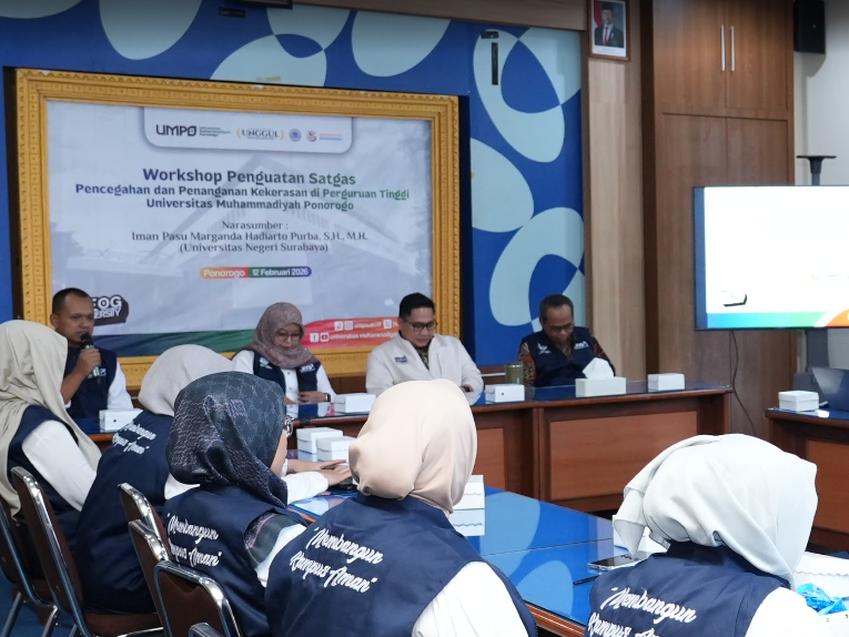 UMPO.AC.ID - Universitas Muhammadiyah Ponorogo (UMPO) menggelar Workshop Penguatan Satuan Tugas Pencegahan dan Penanganan Kekerasan di Perguruan Tinggi pada Kamis, 12 Februari 2026. Kegiatan ini merupakan langkah strategis kampus untuk memperkuat peran Satgas yang telah dibentuk sejak September 2025 lalu. Kehadiran Satgas ini menjadi garda terdepan dalam melindungi mahasiswa, dosen, maupun tenaga kependidikan dari berbagai bentuk kekerasan, termasuk pelecehan yang saat ini modusnya semakin berkembang seiring dengan dinamika dunia digital.