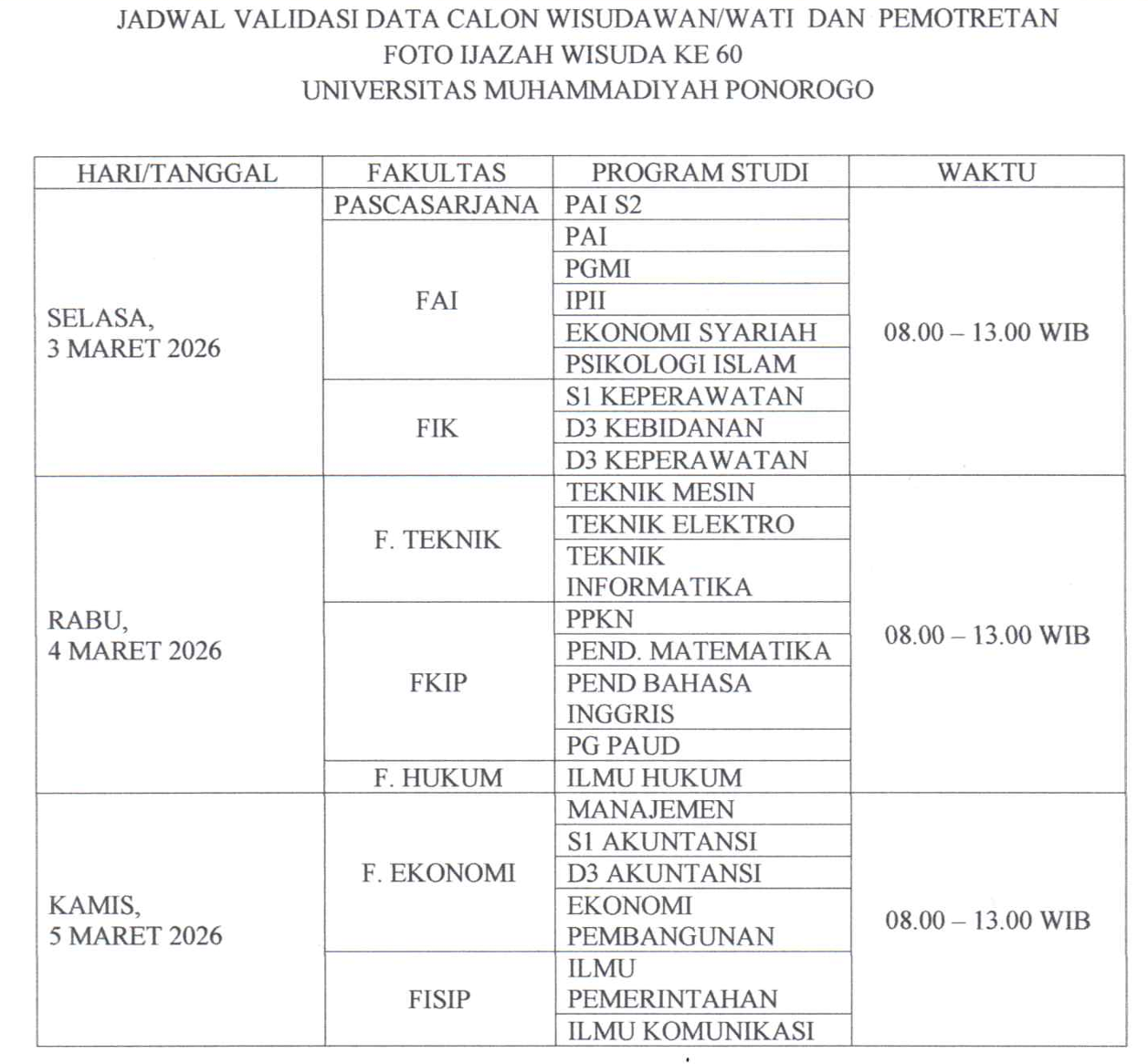 Berikut Infromasi Wisuda ke-60 Pascasarjana Sarjana dan Diploma Universitas Muhammadiyah Ponorogo Surat Edaran terlampir Download Jadwal Validasi Data Calon Wisudawan dan Pemotretan Foto Ijazah Wisuda ke 60